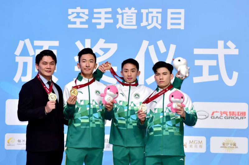 欣聞澳門空手道運動員郭建恆、方文浩及鄭沘珞,在第十五屆全國運動會空手道男子團體型比賽中勇奪金牌,為澳門特區在本屆全運會贏得了首面奬牌,更是澳門特區參加全運會以來的第一面金牌,締造了澳門體育事業的新紀錄。本人謹代表澳門特區政府並以個人名義,向三位運動員表示最誠摯與熱烈的祝賀,並向所有在全運會賽場上的澳門參賽人員及澳門賽區的每名工作人員致以親切的問候。