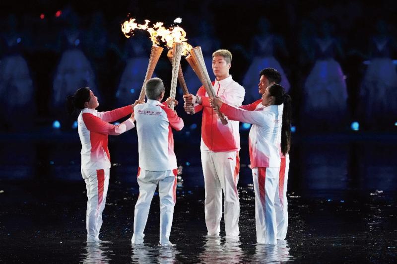 激動人心的場內火炬傳遞和主火炬點燃儀式開始。11月2日,第十五屆全運會火炬在粵港澳三地同步傳遞,最後匯入廣東奧體中心。萬衆矚目下,馬琳、陳若琳、黃金寶、方文浩、郭晶晶、王欣瑜、王柳懿、王芊懿、樑偉鏗、賴宣治、冼東妹、容志行等12位火炬手接力傳遞,最後由蘇炳添、張家朗、李禕共同點燃全運會主火炬。